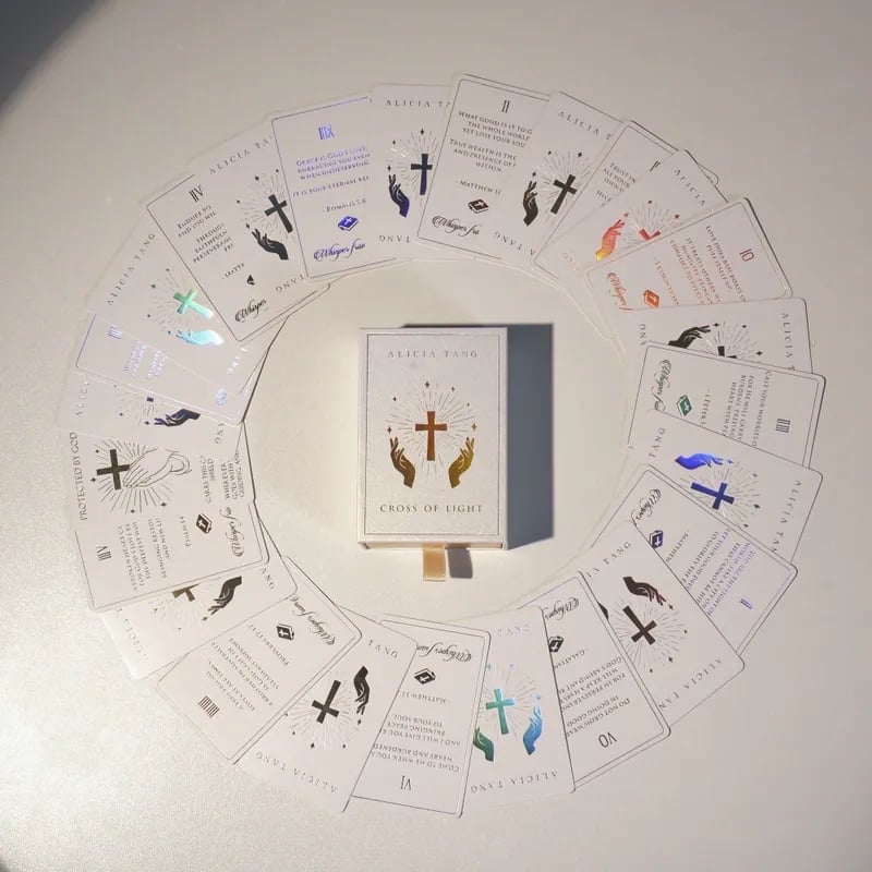 在忙碌的日常中,我們常常需要一絲寧靜、一道溫柔的光芒,來引導內心的平靜與力量這副《光之十字架》神諭卡,靈感源自耶穌永恆的教導,精選聖經中最深刻的經文,重新詮釋成簡單而真摯的訊息,點亮愛、平安與恩典的本質。 無論是早晨的靜思、午後的喘息,或是夜晚的反思,只需隨手一抽,就能感受到耶穌如慈父般輕聲耳語,療癒心靈、肯定自我,讓祂的智慧成為你面對挑戰時的可靠指引。 【源自聖經的永恆智慧教誨】 52張經典聖經經文,來自四福音書的核心教導 化作溫暖的日常啟發 每一句話都如耶穌親口低語 幫助你在壓力中尋得力量、在迷茫中發現方向 適合所有追求內在平安與靈性成長的靈魂 【每日清晨一張,帶來片刻的平安】 無論清晨設定意圖、忙碌中尋找平靜, 或是傍晚回顧一天,這副牌卡就是你的私人聖殿。 只需深呼吸、洗牌、默念「主啊,請賜我今日的指引」,依直覺抽取,就能讓耶穌的愛充滿你的心田 【藝術家Alicia Tang的手繪粉彩】 Alicia Tang以溫柔的手繪粉彩, 重新詮釋基督教默想的靈性與內在寧靜之美 柔和的線條與光影 彷彿耶穌的張開雙手接納每一個需要療癒的靈魂 【抽屜盒變身優雅立架】 精心設計的抽屜式盒子,不僅保護牌卡 更可輕鬆轉換成展示架 讓今日的訊息靜靜矗立在你的書桌或床頭 整日提醒你信仰的溫柔與平安 成為你桌面上的一道聖光 【完美禮物,獻給基督教的靈性探索者】 這套「光之十字架」啟發牌卡 包裝精美大方,宛如一份心靈的禮遇 無論送給基督徒,或是喜愛神諭卡、肯定卡的朋友 或是那些在自省與內在平安中尋求工具的家人 都蘊含滿滿的祝福與祈禱 【這副牌卡不僅是工具,更是守護】 讓耶穌的愛成為你內心的指南針 引領你走向更覺知、更喜樂的人生 無論自用收藏,或贈送給親愛的靈性夥伴 皆是滿載心意的禮物